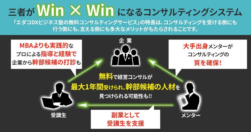 「エダコDXビジネス塾の無料コンサルティングサービス」は、コンサルティングを受ける側にも、行う側にも、支える側にも多大なメリットがもたらされる新しいコンサルティングの仕組みを導入しています。
