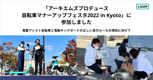 株式会社Luup(本社:東京都千代田区、代表取締役社長兼CEO:岡井大輝、以下「Luup」)は、2022年11月6日(日)に京都市の梅小路公園七条入口広場で開催された「アーキエムズプロデュース 自転車マナーアップフェスタ2022 in Kyoto」に参加しました。