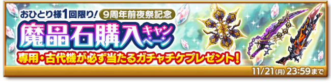 期間中の魔晶石購入金額が合計4,800円に達すると、一部を除く専用武器・古代機だけがラインナップした「9周年前夜祭記念ガチャチケット」をプレゼント!