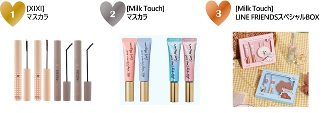 今月は、『マスカラ』をピックアップして月間ランキングをご紹介します。1位には、[XIXI]のマスカラがランクイン。豊富なカラーやタイプから好みに合わせて選択できます。2位[Milk Touch]のマスカラは、まつ毛1本1本をキメ細かくコーティングし、魅力的な目元を演出します。3位には、 [Milk Touch]のボリュームマスカラとロングマスカラ、手鏡がセットになったLINE FRIENDSスペシャルBOXがランクインしました。パッケージが可愛いだけでなく、まつげにしっかりと密着し好みの仕上がりに合わせて使用できるアイテムがランクインする結果となりました。