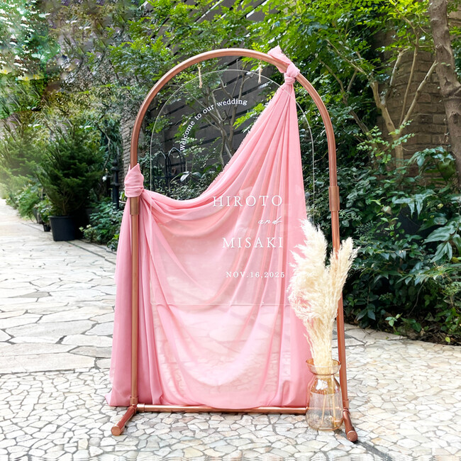 プレ花嫁のInstagramで話題のアーチ型コッパー風スタンド、ウェルカムボード、デコレーション布がセットになっており届いたらすぐに海外ウエディング風のウェルカムスペースが完成する人気アイテムです。