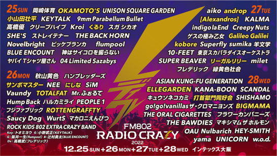 3年ぶりにインテックス大阪での開催が決定した、FM802が毎年年末にお送りするロック大忘年会「FM802 RADIO CRAZY」。今年は初の4日間、12月25日~28日に開催します。この度、メインステージの全出演者を発表しました!