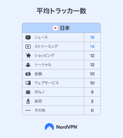 サイバーセキュリティ企業NordVPNの最新調査によると、日本のWebサイトには平均13のトラッカーがあり、データを収集し収益化することがわかりました。日本のショッピング、ニュース、ストリーミングのWebサイトはさらに多く、平均で14のトラッカーが存在します。