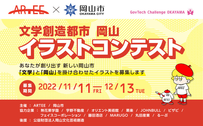 イラスト・デザインコンテストのプラットフォームARTEE(アーティー)を運営する株式会社ARTEE(本社:岡山県岡山市、代表取締役:大西 徹、以下ARTEE)は、この度、岡山市と協働で、市民に文化芸術を身近に感じてもらうとともに、アーティストの可能性を拡げるための取り組みとして、「文学創造都市岡山イラストコンテスト」を実施します。