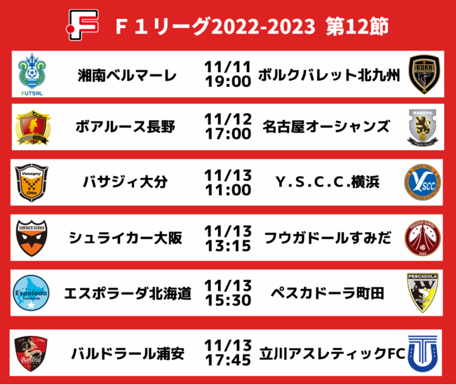 11月11日(金)、11日12日(土)、11日13日(日)にFリーグ2022-2023 ディビジョン1 第12節の6試合を開催いたします。