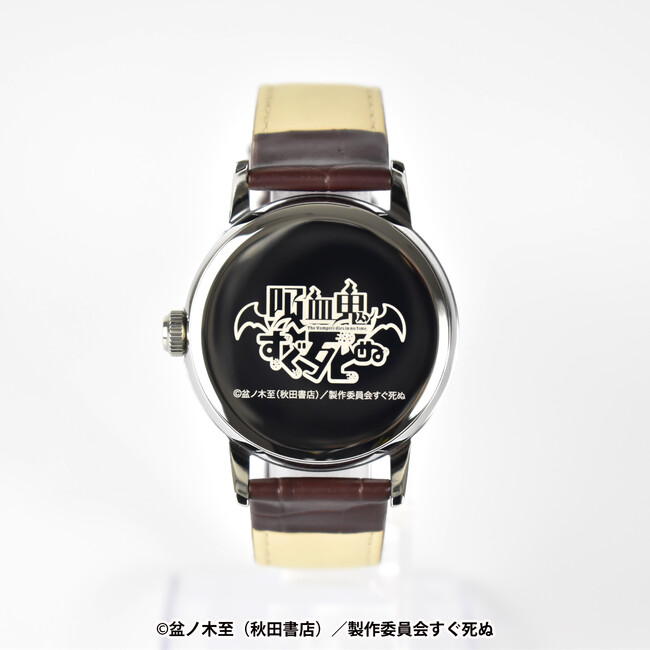 裏蓋にはTVアニメ『吸血鬼すぐ死ぬ』のロゴマークが施されています。表を向けても裏を向けても作品をそばに感じられるのは、ファンにとって嬉しいポイント!