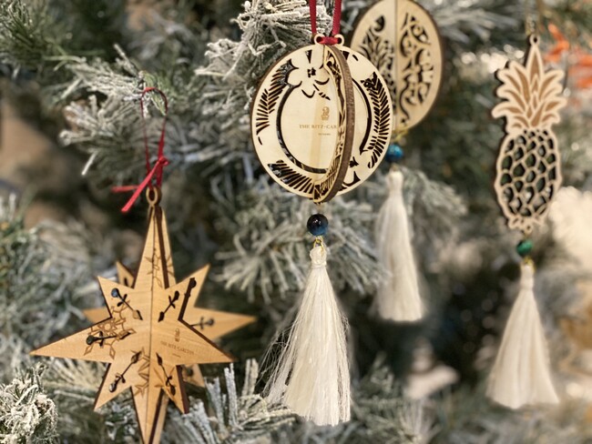 今年のオーナメントの素材には、沖縄県が国内の生産量トップを誇るパイナップルの葉の廃材を使用することで、当ホテルが掲げている持続可能な観光への取り組みを推進してまいります。今年のデザインは、沖縄北部の自然にインスピレーションを得て、やんばるの星空や、パイナップルやハイビスカスの花やヤシの葉をモチーフに用いています。それぞれのオーナメントは、天然石のビーズとタッセルの飾りがつき、タッセルは、パイナップルの葉の廃材を再使用して取り出した繊維と綿を混合して製作いたしました。