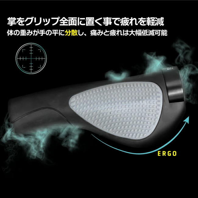 エルゴデザインなので掌をグリップ全面に置く事で長時間の走行でも疲れを軽減します。