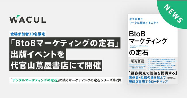 当社代表取締役でありBtoBマーケティングの専門家である垣内勇威が、これまでのコンサルティング経験をまとめた書籍『BtoBマーケティングの定石~なぜ営業とマーケは衝突するのか?』が11月24日(ネット書店は11月25日)に発売されます。それに伴い、代官山蔦屋書店にて参加者数限定の出版記念イベントを開催します。