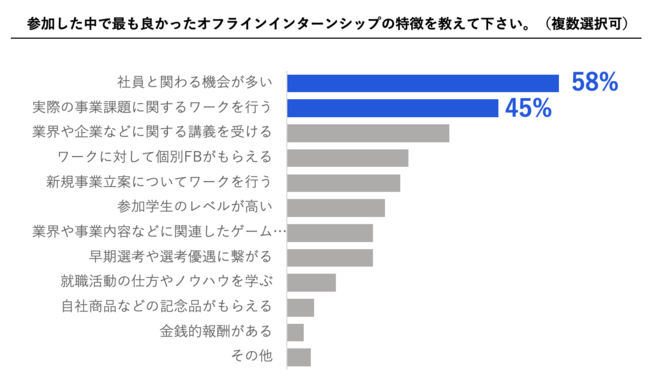 オフラインインターンシップで好評だった特徴は「社員と関わる機会が多い」が58%、次いで「実際の事業課題に関するワークを行う」が45%でした。ただ説明を聞くだけではなく、社員とのワークに取り組むことにより人柄や職場の雰囲気を理解したいというニーズがうかがえる結果となりました。