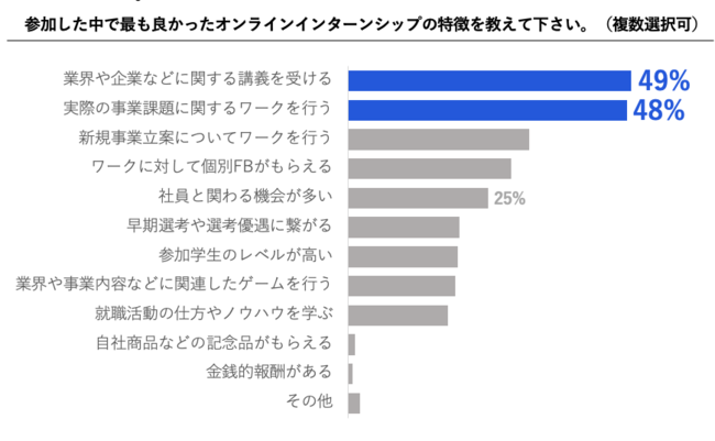 オンラインインターンシップで好評だった特徴は「業界や企業などに関する講義を受ける」が49%、次いで「実際の事業課題に関するワークを行う」が48%でした。一方で、「社員と関わる機会が多い」という回答も25%を占めており、「オンラインコンテンツにおいて可能な限り多くの情報を得たい」とタイムパフォーマンスを重視する考え方が見てとれます。