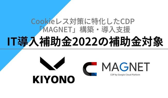 株式会社KIYONO(本社:東京都渋谷区、代表取締役:清野賢一、以下KIYONO)は、「IT導入補助金2022」において、IT導入支援事業者に採択されました。補助金対象となるITツールとして独自CDPサービス「MAGNET」の構築・導入支援が登録されました。これにより、中小企業・小規模事業者等が補助事業者に採択された場合に、MAGNET構築にかかる導入費用及びライセンス費用の一部が補助されます。