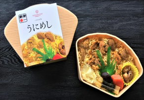 うにの出汁で炊き上げたうに飯の上にいわきの郷土料理うにの貝焼きをのせた贅沢な駅弁です。