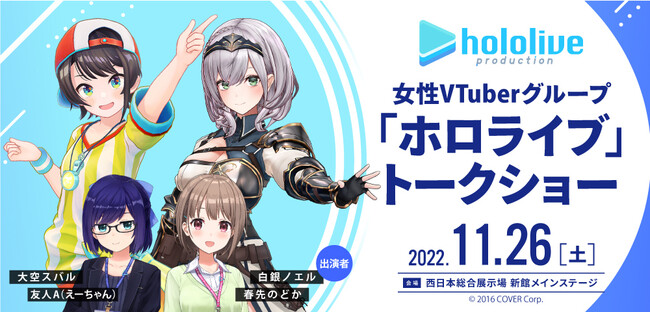 カバー株式会社(本社:東京都千代田区、代表取締役社長:谷郷元昭)は、当社が運営する女性VTuberグループ「ホロライブ」において、2022年11月26日(土)より北九州市で開催される北九州ポップカルチャーフェスティバル2022に出展することをお知らせいたします。