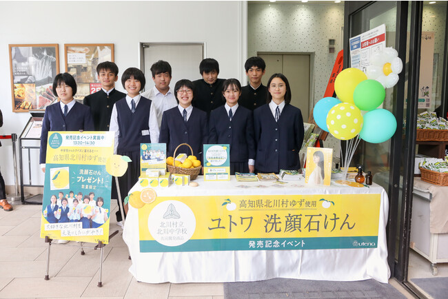 北川村と包括連携協定を結んでいるパートナー企業のウテナとウエルシアが、このアイデアの実現に協力。発売に向けて中学生にマーケティングや販促などの授業を実施し、ウテナが商品開発を、ウエルシアが販売サポートをすることで、今回の「ユトワ 洗顔石けん」の発売となりました。