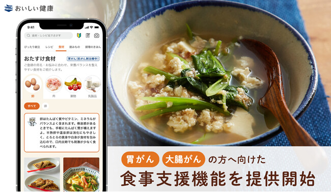 パーソナライズ献立提案・栄養管理支援アプリ『おいしい健康』を運営する株式会社おいしい健康はこのたび、胃がん、大腸がんの方に向けた食事支援機能を提供開始したことをお知らせいたします。(※胃、大腸の手術後への食事対応は準備中です)
