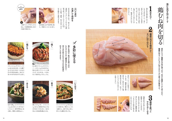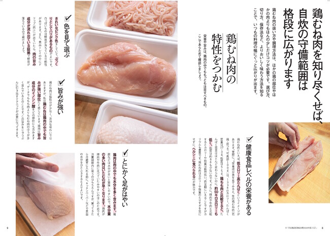 「揚げ物は一口大に切って香ばしさ抜群に」「大きいまま加熱すればしっとり」など、家でも実践することができるプロの技で、定番の唐揚げや照り焼きチキンが、段違いの旨さになります。むね肉で作ったとは思えないほどなので、日常使いするだけでなくおもてなしにもむく美味しさです。また、和食はもちろんのこと、洋風、中華、さらには世界の料理にも注目。むね肉料理のレパートリーが一気に広がります。