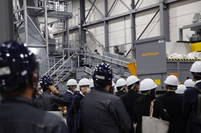 式典後に工場内を見学。使用済みのLIMEXや廃プラスチックを自動選別・洗浄する工程などを実際に見ていただいた。