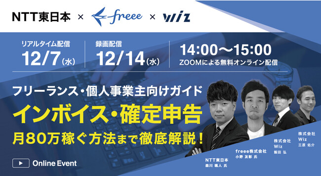 12月7日(水)、12月14日(水)※、株式会社Wizは、【NTT東日本 営業推進本部 営業部 第一営業部門 森川 颯人氏】【freee アライアンス事業部 マネージャー 小野 友彰氏】をお迎えして、インボイス制度や確定申告などフリーランス・個人事業主にとって必須の手続きと、フリーランスとして高額報酬を稼ぐ具体的な成功事例をお伝えするウェビナーを開催します。