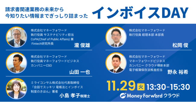 そのほか、請求書関連業務に関する今後の変化について、デジタルインボイス推進協議会のメンバーで、当社執行役員の瀧よりお話しします。また、当社ビジネスカンパニーCSOの山田より、マネーフォワードがインボイス制度に対する取り組みをご紹介いたします。