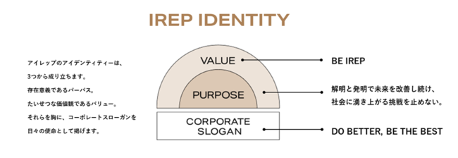 パーパスとはアイレップの社会における存在意義であり、我々が社会に存在する理由を言語化したものです。スローガンとは、パーパス実現に向けた使命であり、お客様・社会への約束を表します。そしてバリューは、パーパス実現に向けた、アイレップ共通の価値観・行動指針となります。それら全てをもって「IREP IDENTITY」といたしました。25周年という節目の年において掲げた新たなIREP IDENTITYのもと、今後もデジタル起点のマーケティングを牽引する存在として飛躍して参ります。