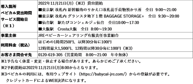 ◆JREベビーカーシェアリング有限責任事業組合(組合員:東日本旅客鉄道株式会社、株式会社ジェイアール東日本企画)は、子育て世代が子供たちと気軽に外出できる社会の実現を目的として、外出先でも便利に利用できる、予約可能なベビーカーレンタルサービス「ベビカル」を展開しています。