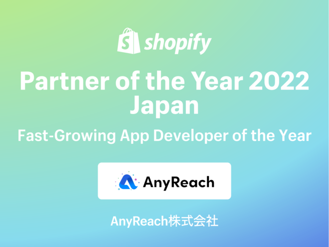 AnyReach株式会社(本社:東京都中央区、代表取締役:中島 功之祐)が運営するeギフト機能を自社ECサイトに導入できる『AnyGift(エニーギフト)』が、「Shopify(ショッピファイ)」の日本法人Shopify Japan 株式会社が主催する「Shopify Partner of the Year 2022 - Japan」表彰式にて、数千社のパートナー企業から選ばれる「Fast-Growing App Developer of the Year 2022」を受賞致しました。
