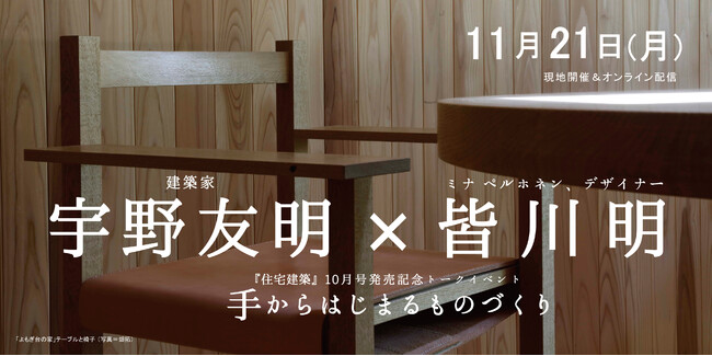建築・住宅・インテリア・資格等の専門書を発行する株式会社建築資料研究社(所在地:東京都豊島区、代表取締役社長:馬場栄一)は、雑誌『住宅建築』2022年 10月号の発売を記念し、2022年11月21日(金)にトークイベントを開催いたします。同号の特集で紹介した建築家の宇野友明さんと、宇野さんの作品をInstagramで知り、自身のものづくりに通ずるものを感じたというミナ ペルホネンの創業者でデザイナーの皆川明さんをお迎えします。