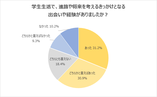 「学生生活で、進路や将来を考えるきっかけとなる出会いがあった」と回答した学生は、31.2%でした。「どちらかと言えばあった」30.9%を合わせると、約6割の学生が、学生生活において進路や将来を考えるきっかけとなる出会いを得ていることが分かります。「インターンシップで仕事を体験し、志望業界を決めることができた」「コロナ禍で行動制限があったものの、大学の就職ガイダンスやオンラインセミナーなどで就職へのイメージを持つことができた」「ゼミでOB・OGと交流するなかで、働きたい業界や職種を見つけることができた」といった声が寄せられました。一方、「オンライン授業が大半で、リアルな場で体験や経験の機会を得ることができなかった」「直接現場に触れたり、対面でのコミュニケーションの機会をあまり持てなかった」「オンラインでのインターンシップでは実際に働くイメージがわかず、まだ具体的な志望業界を決められていない」といった声も上がっています。