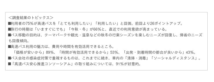 全国の高速バス事業者64社が参画する高速バス安心推進コンソーシアムは、お客様に安心して利用いただけるサービスを検討することを目的に、コロナ禍におけるお客様の意識や行動変化を調査するアンケートを2022年10月12日(水)~23日(日)に実施しました。