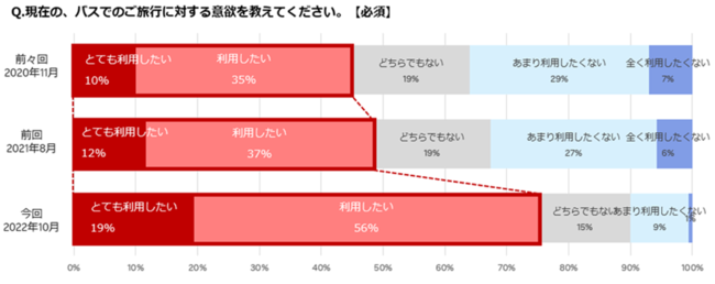 「現在のバスでのご旅行に対する意欲を教えてください」という質問に、「とても利用したい」「利用したい」と回答した人の合計は75%。前回の調査では49%だったため、26ポイントアップ。多数の人が、高速バスでの旅行に意欲を示している。