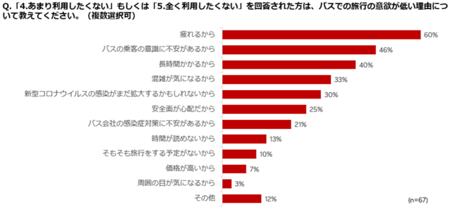 一方で「バスでの旅行意欲が低い理由」については、「疲れるから」が1位となっているが、前回まで1位だった「新型コロナの感染がまだ拡大するかもしれないから」は5位に順位を下げており、少しずつポストコロナに向けた意識の変化が伺える。