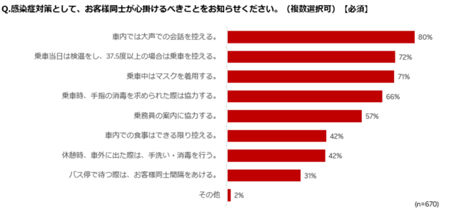 「感染症対策として、お客様同士が心掛けるべきことをお知らせください」という質問については、「車内での大声での会話を控える」という回答が最も多くなっている。また、「37.5度以上の場合は乗車を控える」、「乗車中はマスクを着用する」などは前回同様意識が高く、利用者同士での感染予防対策の意識は薄れていないことが伺える。