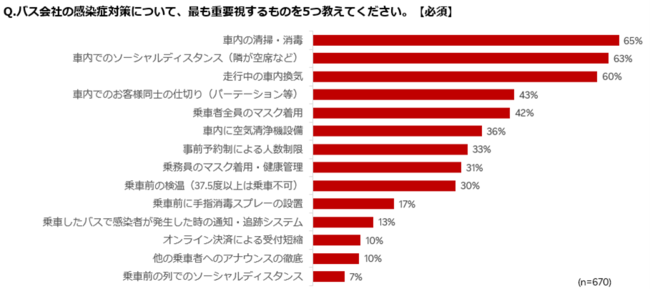 お客様が事業者に求める感染対策は、「車内の清掃・消毒」「車内でのソーシャルディスタンス」「走行中の車内換気」がこれまでと変わらず上位となった。多くのバス会社は運行終了後、アルコール消毒液を使い、手すりや座席、乗客が触れる場所などを除菌清掃したり、運行中はエアコンを外気導入したり換気扇を回したり、休憩時に換気をしたりしているが、この対応が引き続き求められていることがわかる。