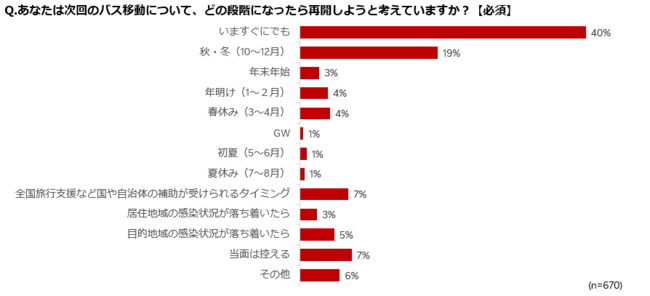 次のバス利用のタイミングについては、「いますぐにでも」と答えたユーザーが40%、秋・冬(10~12月)が19%、年末年始が3%、年明け(1~2月)が4%との結果となり、直近での利用意欲が高まっている。