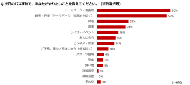 次回のバス移動の目的は、「テーマパーク・遊園地」、「観光・行楽(テーマパーク・遊園地を除く)」、「温泉」などの秋冬の行楽シーズンを楽しむニーズや、年末年始の帰省のニーズが上位となっており、今冬にバス移動の需要回復が見込まれる。
