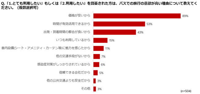 バスでの移動意欲が高い理由については、1位「価格が安いから」2位「時間が有効活用できるから」3位「出発・到着時間の都合が良いから」となっており、費用や時間を有効活用できる点が高速バスの魅力となっている。