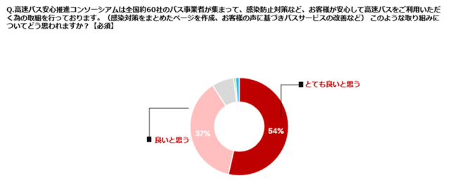 最後に、感染対策をまとめたサイトページの作成や、お客様の声に基づいたバスサービスの改善などを行う高速バス安心推進コンソーシアムの活動について、「とても良いと思う」「良いと思う」と回答した人は91%にのぼった。