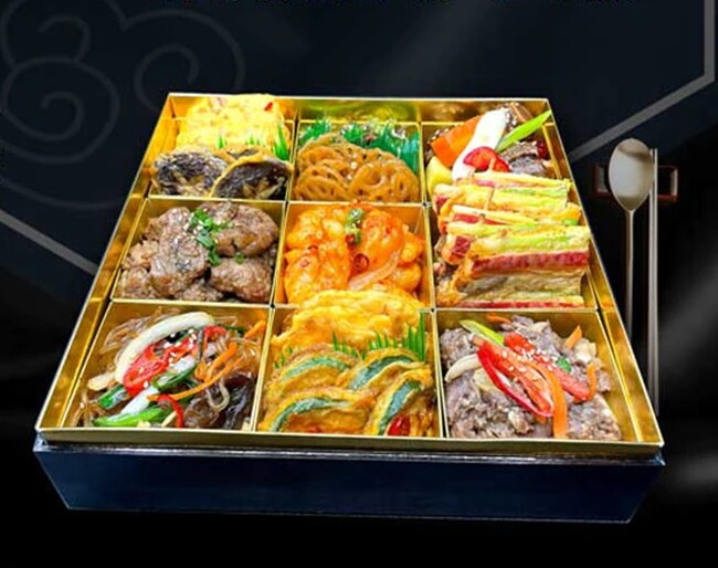 本場韓国の味を楽しめる赤坂の兄夫(ヒョンブ)食堂の韓国おせち。素材にこだわったシイタケチヂミやテルチムなど全12品。
