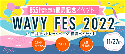 株式会社金沢シーサイドFM(本社:横浜市金沢区、共同代表取締役:松原勇稀、尾澤仁虎瑠、以降、「当社」)は、本年10月1日に放送を開始したコミュニティFM局「金沢シーサイドFM」の開局を記念し、2022年11月27日(日)に開局記念イベント「WAVY FES 2022 in 三井アウトレットパーク 横浜ベイサイド」を三井アウトレットパーク 横浜ベイサイド 「CブロックF くじらの大屋根広場」にて開催します。
