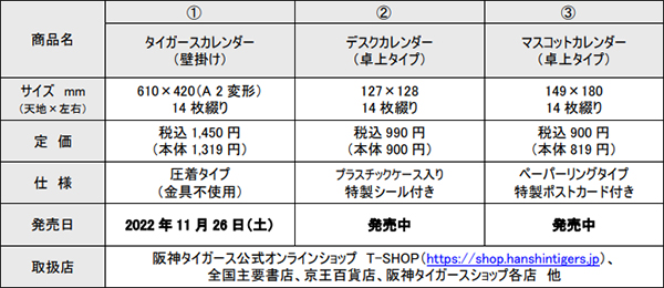 通信販売でのご注文は、阪神タイガース公式オンラインショップT-SHOP( https://shop.hanshintigers.jp/ )及び阪神タイガースカレンダー事務局( https://hcl-c.com/shop/calendar2023/ )で随時受け付けております。