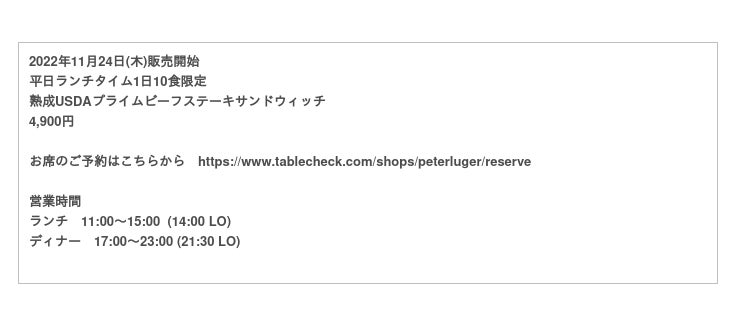 2022年11月24日(木)より、 株式会社ワンダーテーブル[本社:東京都新宿区西新宿/代表取締役社長 秋元 巳智雄]は、 ニューヨーク・ブルックリンで創業135年の歴史を誇るステーキハウス「ピーター・ルーガー・ステーキハウス(以下、 ピーター・ルーガー)」の東京店にて、熟成肉を使ったステーキサンドウィッチを販売します。