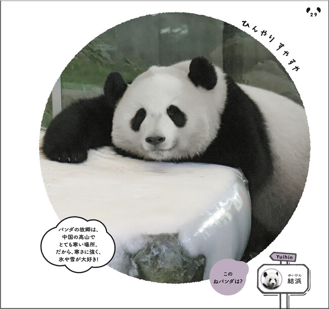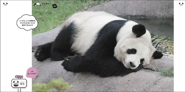 本書では、東京都恩賜上野動物園公園、アドベンチャーワールド、神戸市立王子動物公園で飼育されている13頭を掲載。「かわいい”ね”」「いやされる”ね”」「おやこだ”ね”」などと、独自の切り口で寝姿を分類しています。