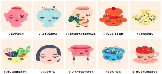 11 月 15 日には本プロジェクト発表と同時に、先行して 5 種類の作品を公開していましたが、この度全 10 種類が出揃うこととなりました。作品は、シシヤマザキ氏が今回のために書きおろした完全新作で、花びんやボウル、カップ等いずれも益子焼をイメージしたものとなっており、益子町特産のいちごや新鮮な野菜とともに、シシヤマザキ氏の特徴的なタッチで描かれています。