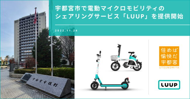 株式会社Luup(本社:東京都千代田区、代表取締役社長兼CEO:岡井大輝、以下「Luup」)は、栃木県宇都宮市が2022年6月に実施した自転車・電動キックボードのシェアリングサービスの実証実験の公募において採択され、2022年12月1日(木)から2023年3月31日(金)まで電動マイクロモビリティのシェアリングサービス「LUUP」を提供します。まずは電動アシスト自転車のみご利用可能となり、2023年1月10日(火)に電動キックボードを導入します。また、日本で電動キックボードのシェアサービスに関する公募が実施されたのは今回が初(※)となります。
