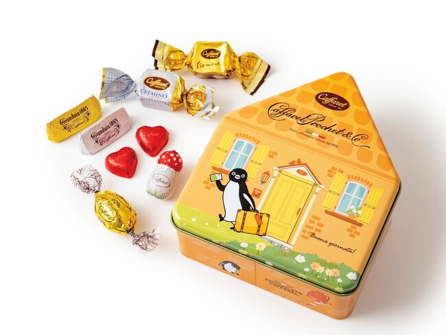 三角屋根のお家の形をした缶に、Suicaカードとトランクを持って旅に出るSuicaのペンギンが描かれています。中にはカファレルの代名詞である、口どけまろやかなジャンドゥーヤをはじめとした人気のホイルチョコレートを19粒アソートしました。