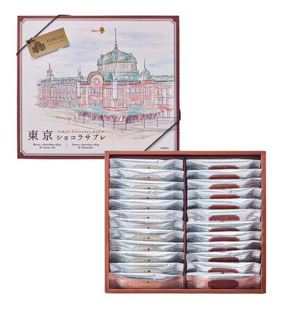 水彩画のような東京駅丸の内駅舎が描かれたパッケージにチョコレートメーカーらしいカカオの味わいをいかしたチョコレートクッキーを詰め合わせました。JR東日本商品化許諾済