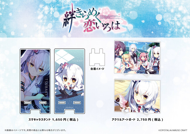 『絆きらめく恋いろは』のグッズには、あると便利なスマキャラスタンド、そしてビッグサイズでイラストを鑑賞できるアクリルアートボードも!