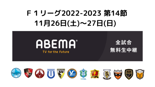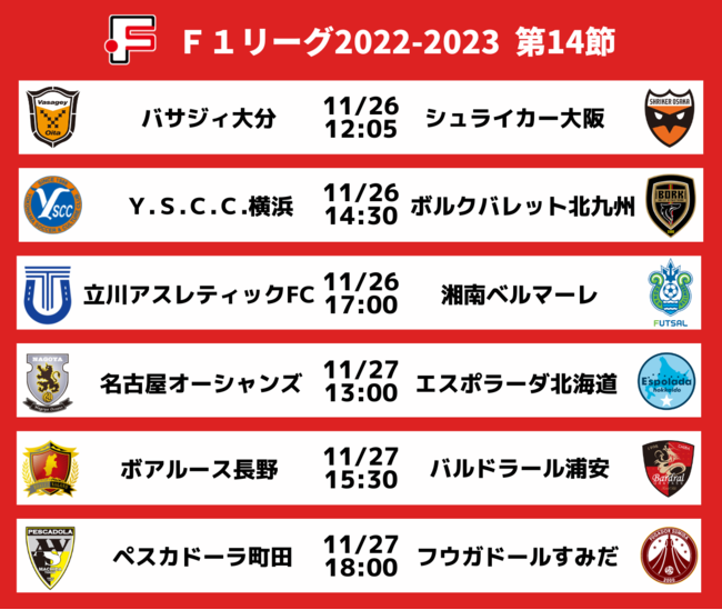 11月26日(土)、27日(日)にFリーグ2022-2023 ディビジョン1 第14節の6試合を開催いたします。