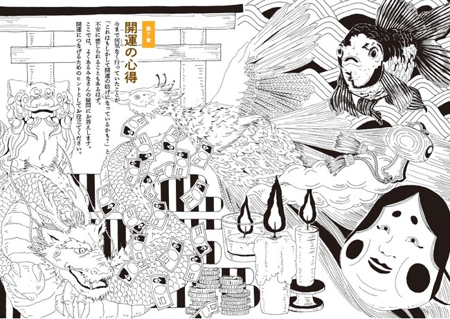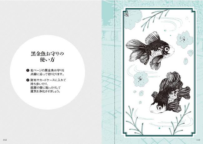 本書のカバーは風水で縁起がいいとされ、悪い運気を浄化してくれる黒金魚をあしらった開運のお札になっています。